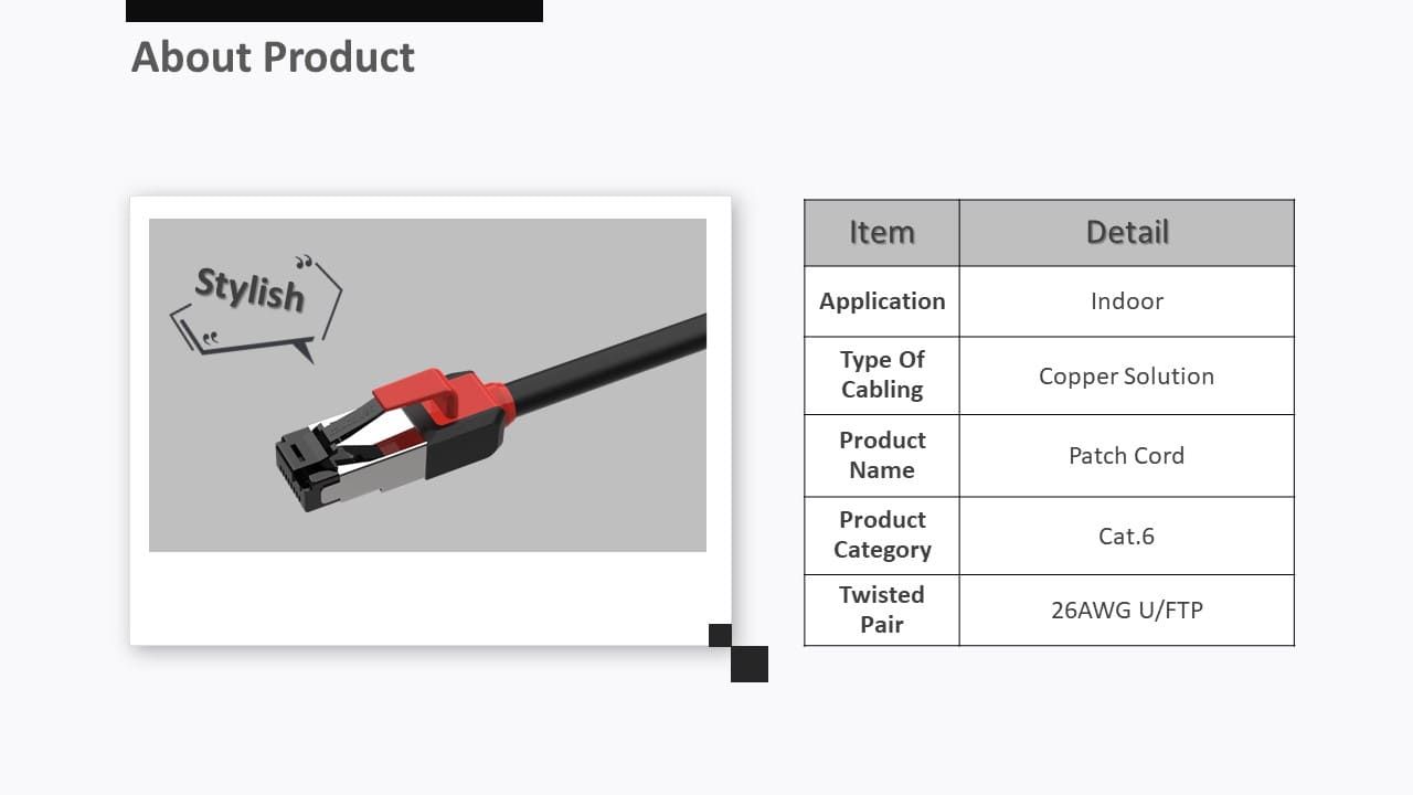 Le nouveau câble de réseau blindé C6 homologué UL offre un choix intelligent et facile pour le câblage structuré dans le câblage commercial ou de centre de données. Lorsque les installateurs doivent entretenir ou modifier le port réseau, il faut toujours beaucoup de temps pour trouver l'étiquette du cordon Ethernet. Le moulage de couleur différente sur le cordon de raccordement aidera les utilisateurs à identifier facilement l'application. Le cordon de raccordement de catégorie 6 est également capable de tester le cordon de raccordement par le testeur Fluke, il garantira la qualité des performances de la connexion.