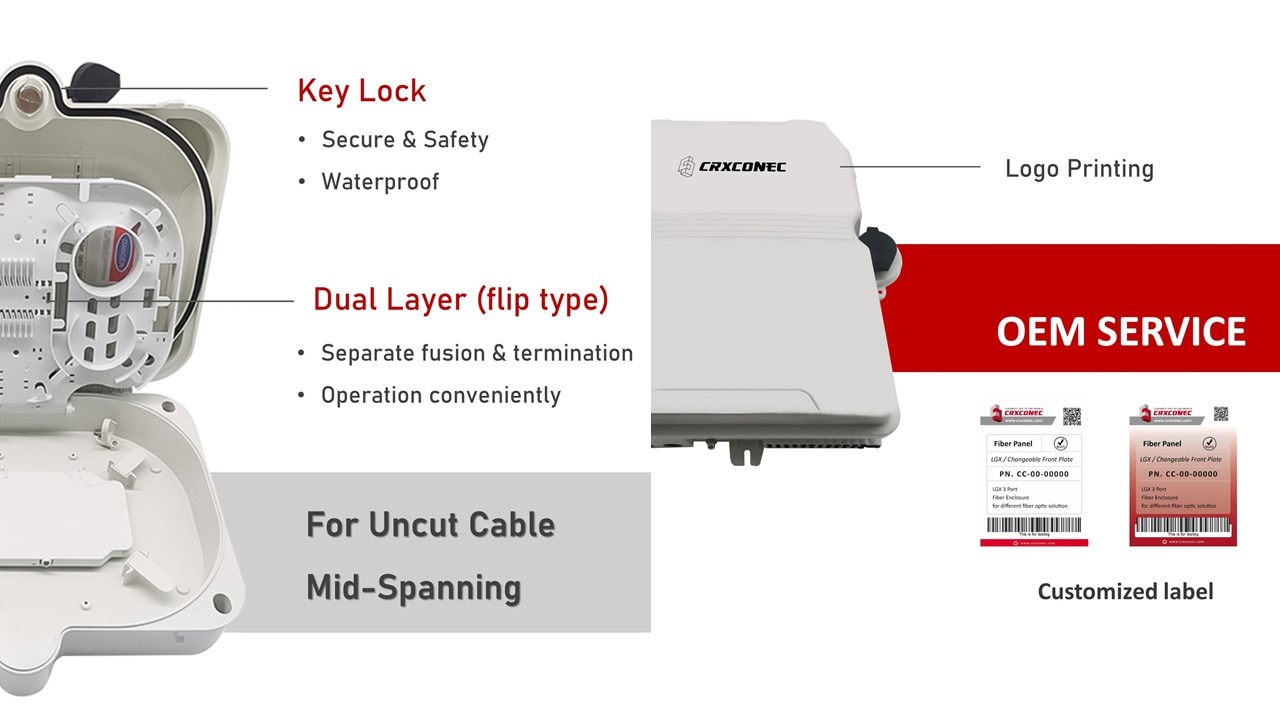 CRXCONEC peut fournir l'option OEM pour avoir votre propre impression de logo de boîte de distribution de fibre à 48 noyaux et personnaliser la conception d'étiquettes appropriée pour le canal de vente.