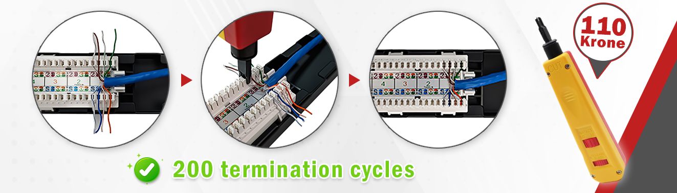 Ce panneau de brassage RJ45 12 ports fonctionne avec un IDC arrière 110 pour une terminaison rapide et facile par poinçonnage. Travailler avec l'outil de poinçonnage de type Krone 110 améliore votre efficacité d'installation. Le panneau de brassage 12 ports Cat6 peut supporter jusqu'à 200 cycles de terminaison sans aucun problème majeur selon les normes UL.